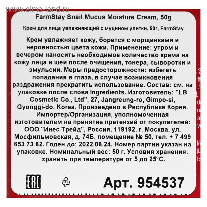 Увлажняющий крем для лица FarmStay, с экстрактом улитки, 50 мл