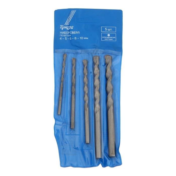 Набор сверл по бетону ТУНДРА, цилиндрический хвостовик, 4-5-6-8-10 мм, 5 шт.