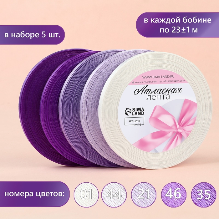 Набор атласных лент, 5 шт, размер 1 ленты: 6 мм × 23 ± 1 м, цвет фиолетовый спектр