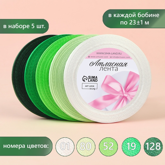 Набор атласных лент, 5 шт, размер 1 ленты: 6 мм × 23 ± 1 м, цвет зелёный спектр