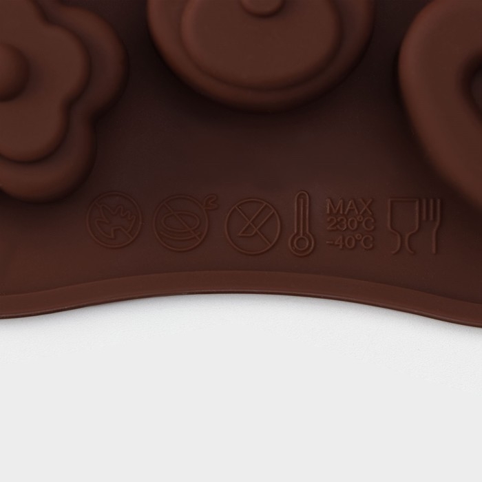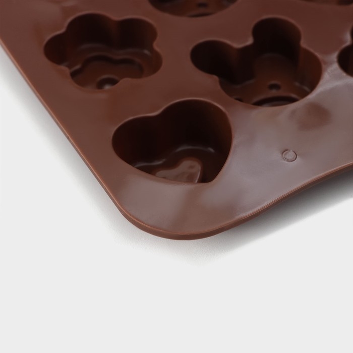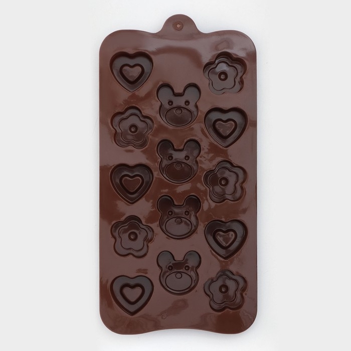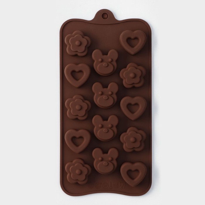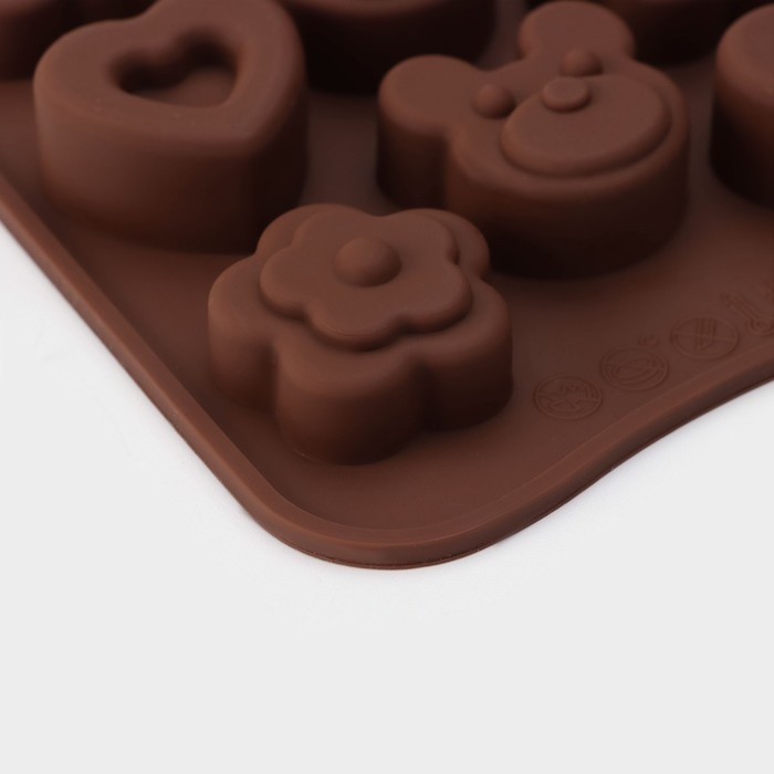Форма для конфет и шоколада Доляна «Мишка, цветок, сердце», силикон, 19,7×10,5×1,5 см, 14 ячеек, цвет коричневый