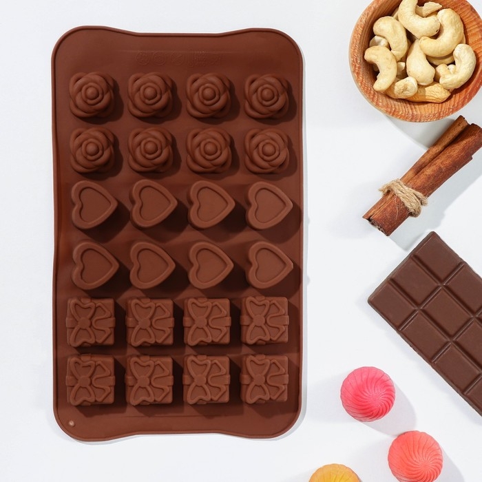 Форма для конфет и шоколада Доляна «Подарок, сердце, роза», силикон, 23,2×13,8×1,1 см, 24 ячейки (2,6×2,6×2 см), цвет коричневый