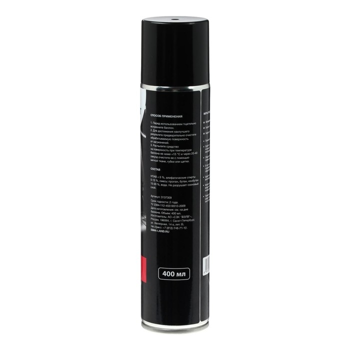 Специальный состав легко удаляет въевшиеся загрязнения с любых видов обивки салона, велюра, кожи, кожзаменителя, ковров и других поверхностей. Очиститель устраняет неприятный запах и обладает антистатическим эффектом.