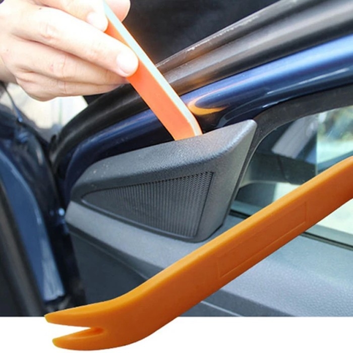 Набор инструментов для разборки салона автомобиля - обеспечивает аккуратность и высокую скорость разбора дверной обшивки практически всех существующих марок автомобилей. Для демонтажа требуемых элементов нужно: завести под край панели, вставить крепление и поддеть.