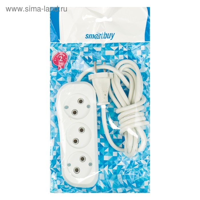 Удлинитель Smartbuy, 3 розетки, 2 м, 10 А, 2200 Вт, ПВС 2х1 мм2, без з/к, белый