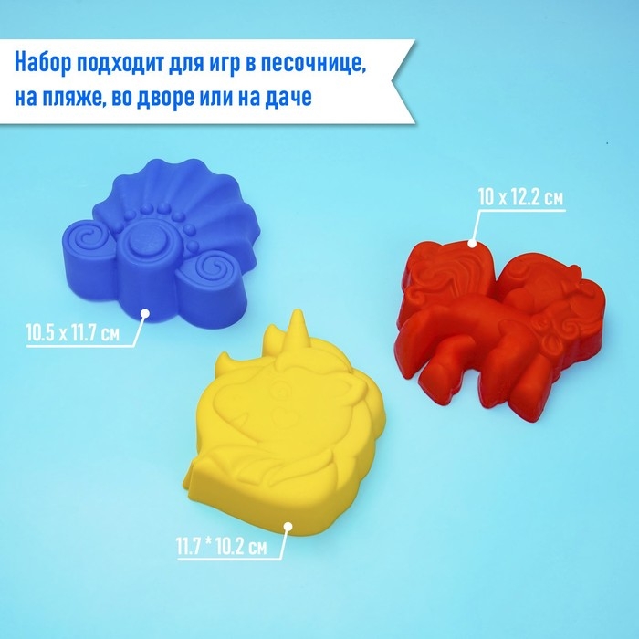 Яркий набор дополнит и разнообразит детские игры в песочнице. Все предметы выполнены из гипоаллергенного пластика, разработаны и изготовлены в России из отечественных материалов с учётом всех требований ГОСТ.