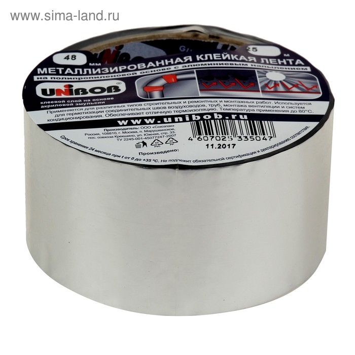 Металлизированная клейкая лента Unibob с алюминиевым напылением применяется для различных типов строительных и ремонтных работ. Лента изготовлена на полипропиленовой основе с алюминиевым напылением, клеевой слой на акриловой основе обеспечивает высокую адгезию.