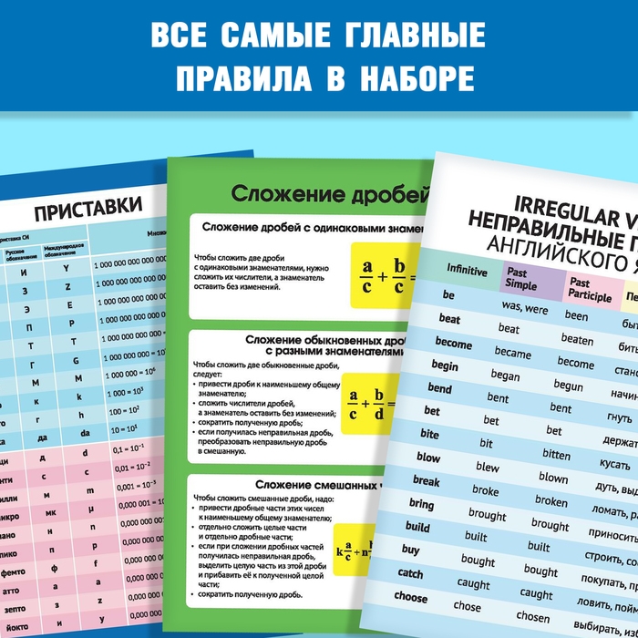 С набором книжек ребёнок закрепит знания, полученные на уроках по русскому, английскому языку, математике, физике и химии. В пособиях в краткой форме изложены основные правила. Теория подкреплена простыми и понятными примерами. Пособие станет хорошей памяткой при выполнении домашнего задания и подготовке к контрольным работам.