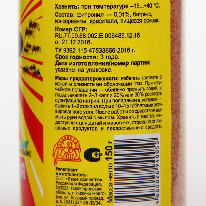 Применение: гранулы размещают на подложках из непищевых материалов, которые расставляют в местах обитания, скопления или передвижения насекомых, либо насыпают их непосредственно на муравейники или муравьиные дорожки.