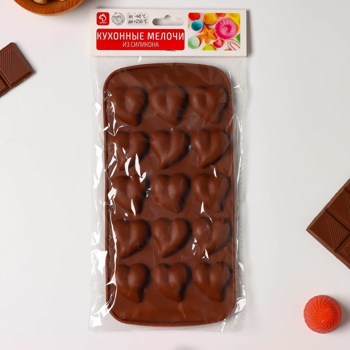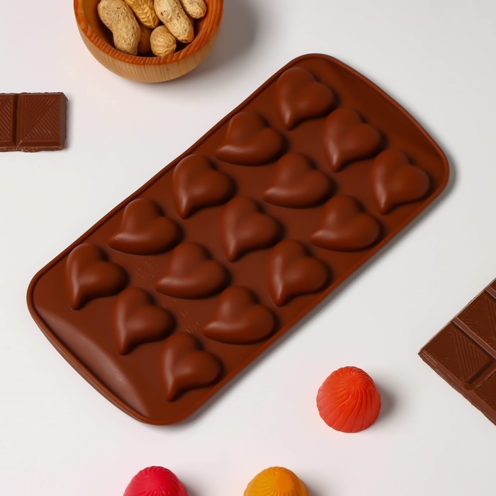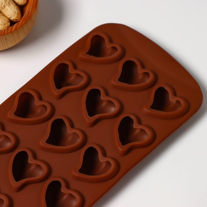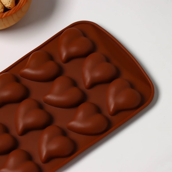 Форма для конфет и шоколада Доляна «Сердца», силикон, 21,5×10,5×1,8 см, 15 ячеек (3×3 см), цвет коричневый