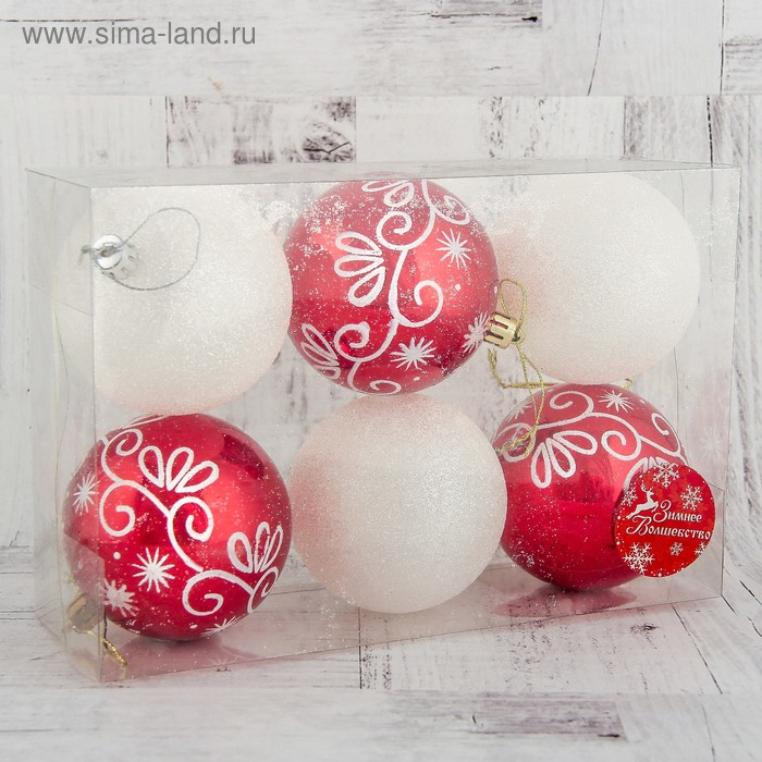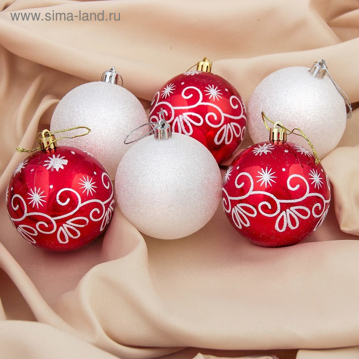 Набор шаров пластик d-8 см, 6 шт "Изящный узор" красно-белый