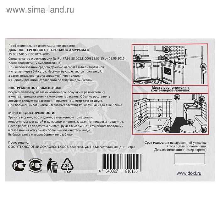 ОписаниеКомплект, состоящий из 4 ловушек и пакета с гелем (40 мл), содержит самую правильную пропорцию геля и ловушек для обработки помещений с не высокой и средней степенью зараженности тараканами. Примерный расход средства в условиях обычной квартиры: Если тараканов мало, они появились недавно 1 упаковки хватит на 40 кв. метров. Если тараканов мало, они появились давно 1 упаковки хватит на 10 кв. метров. Если тараканов много, они появились недавно 1 упаковки хватит на 6 кв. метра. Если тараканов много, они появились давно 1 упаковки хватит на 4 кв. метра.Составдиазинон 0,5% технические компоненты 99,5%Инструкция по применению: размять упаковку, затем вскрыть её ножницами согласно инструкции. Аккуратно нанести гель полосками по периметру помещения: вдоль стен и плинтусов, а также щелей. Особое внимание необходимо уделить вентиляционным отверстиям. Ловушки расставляются в местах скопления тараканов на расстоянии около 1 м друг от друга.