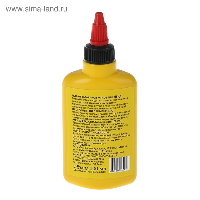 Назначение: Самое эффективное средство от тараканов с повышенным содержанием токсинов и уникальным аттрактантом (приманкой). Подходит для обработки даже сильно зараженных помещений с большим количеством источников альтернативного питания насекомых (кухни, кафе, рестораны и проч.).Способ применения: Нанесение геля каплями в местах обитания и передвижения насекомых.Меры предосторожности: При попадании на кожу или в глаза обильно промыть водой. После применения мыть руки с мылом.Состав: Борная кислота, фипронил, тех компоненты.