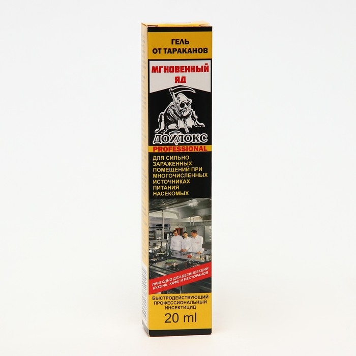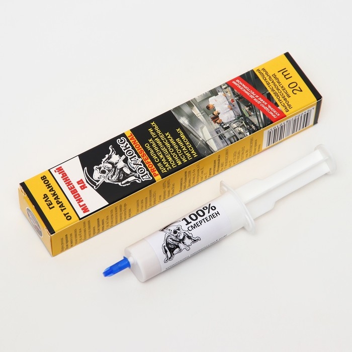 Позволяет очень быстро избавиться от тараканов благодаря уникальному химическому составу, содержащему сверхсильный инсектицид в повышенных концентрациях. Результат виден уже в первые 24 часа после применения. Основная масса насекомых погибает на 2-е — 3-и сутки, а полностью они исчезают из помещений за 5‒7 дней.Инструкция по применению: Аккуратно выдавливать гель, распределяя его небольшими полосками по периметру помещения: вдоль плинтусов, стен, щелей. Особое внимание уделить обработке вентиляционных отверстий. Нанести побольше средства на пол под мойками, батареями отопления, кухонными шкафами и в санузлах.Меры предосторожности: Хранить в сухом, прохладном, затемнённом помещении, недоступном для детей и домашних животных, вдали от пищевых продуктов. После работы со средством вымыть руки с мылом. При попадании в глаза или на кожу смыть большим количеством воды.Состав: фипронил (0,055 %), техкомпоненты (99,945 %).