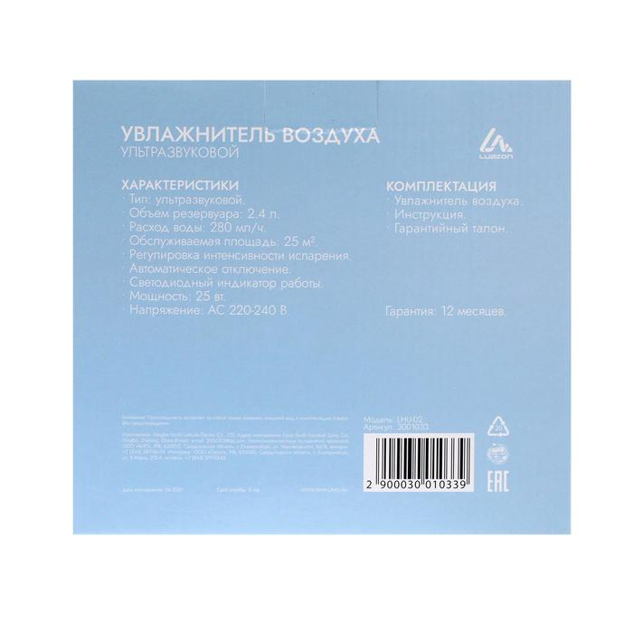 Увлажнитель воздуха Luazon LHU-02, ультразвуковой, 2.4 л, 25 Вт, бело-фиолетовый