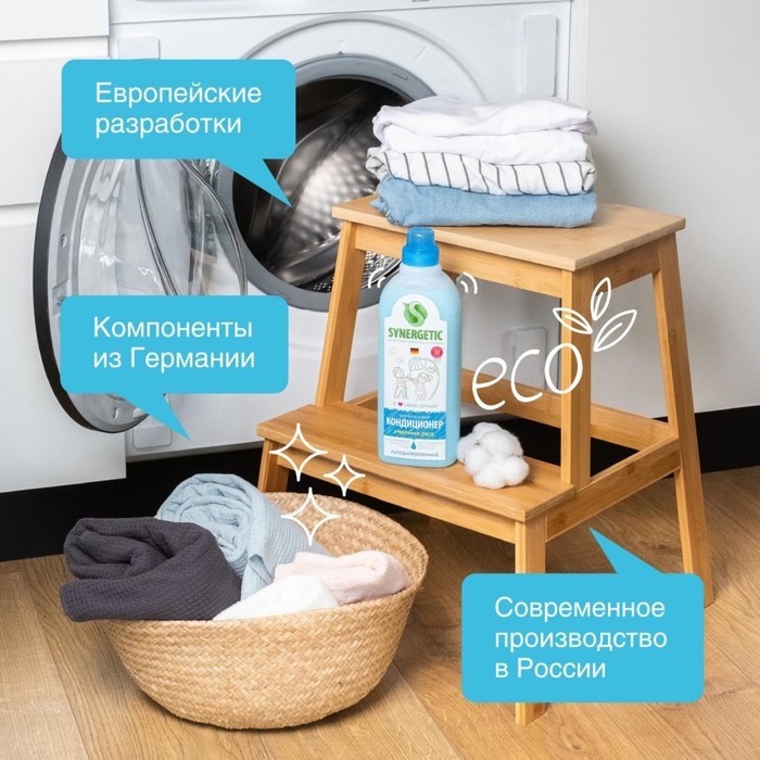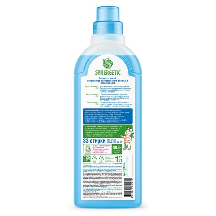 Биоразлагаемый кондиционер-ополаскиватель для белья SYNERGETIC "Утренняя роса" – высокоэффективное средство, бережно ухаживающее за всеми типами ткани, в том числе деликатными, и придающее особую мягкость и нежность белью после стирки.