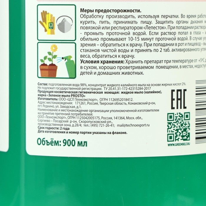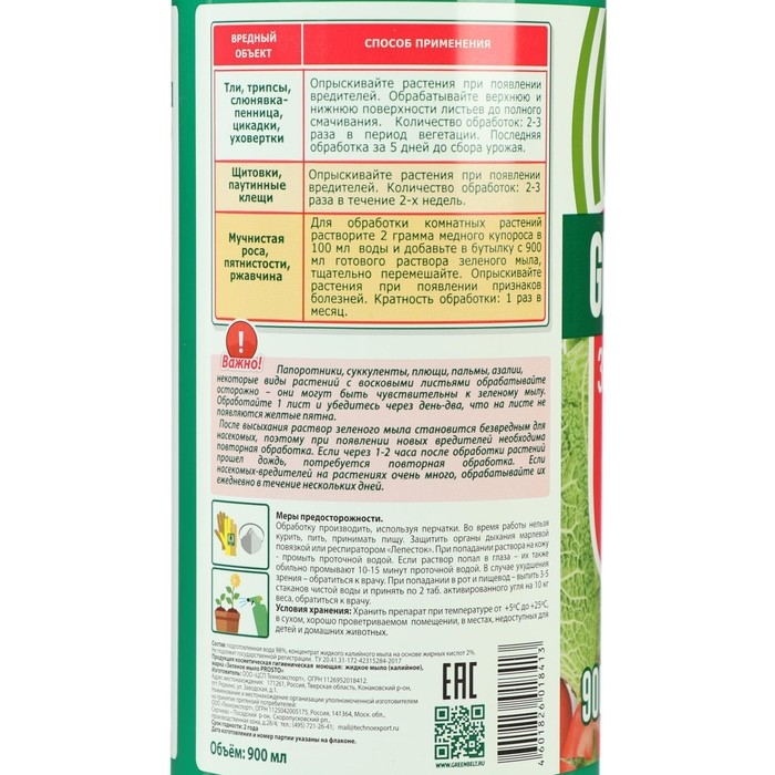 Рекомендации по применению: Грушу, яблоню, вишню, сливу обрабатывают ранней весной, для профилактики заболеваний. При необходимости повторяют обработку в течение летнего сезона 2-3 раза. Малину, клубнику, крыжовник, смородину опрыскивают весной, перед цветением и осенью, после сбора урожая. Помидоры, огурцы, капусту можно обрабатывать во время выращивания рассады (для профилактики). Лук, чеснок во время вегетации, другие культуры по мере необходимости. Цветы и декоративные растения обрабатывают зеленым мылом от вредителей при первых признаках заражения. Обрабатывая цветочные культуры во время бутонизации и цветения, осторожно опрыскивают растения, стараясь не попадать на раскрывшиеся цветки. Обработку комнатных растений зеленым мылом проводят круглый год, после обработки цветок помещают в большой пакет или накрывают пленкой. Хорошо просушивают, раствор не смывают.
