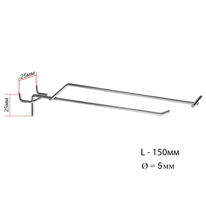 Крючок одинарный для металлической перфорированной панели, d=6 мм, L=15 см, шаг 25 мм, цвет хром