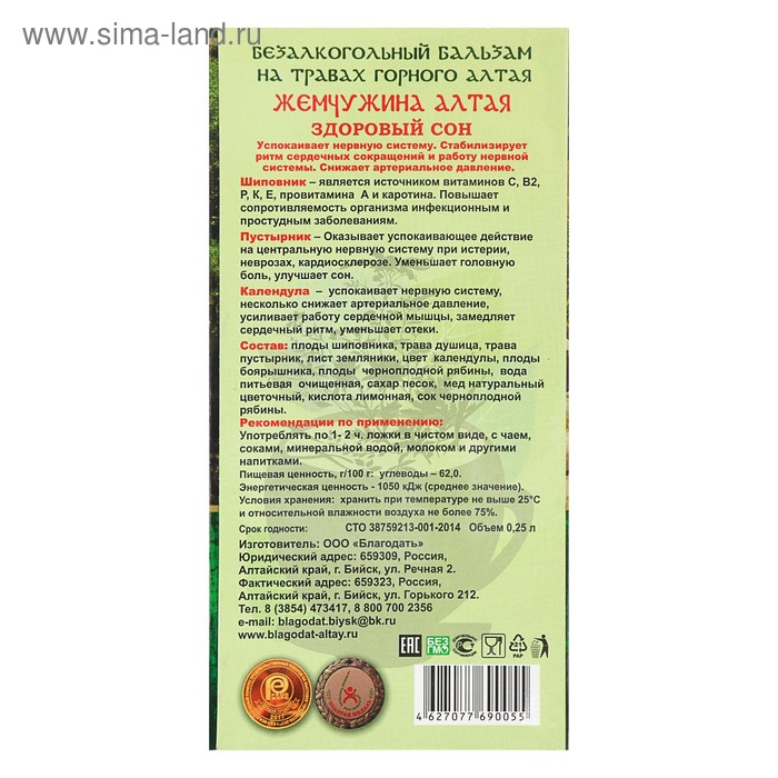 Бальзам безалкогольный "Жемчужина Алтая" здоровый сон, 250 мл