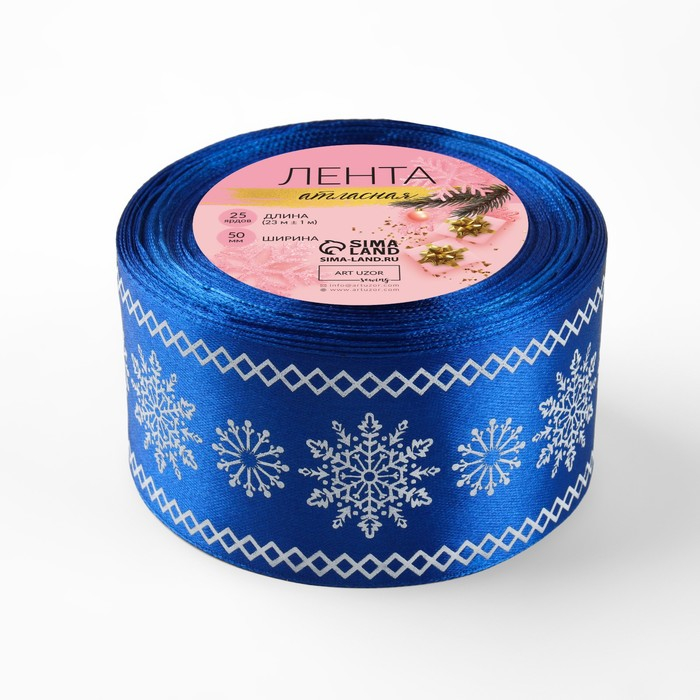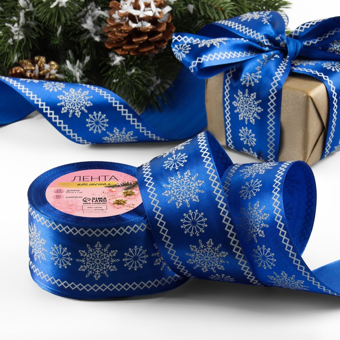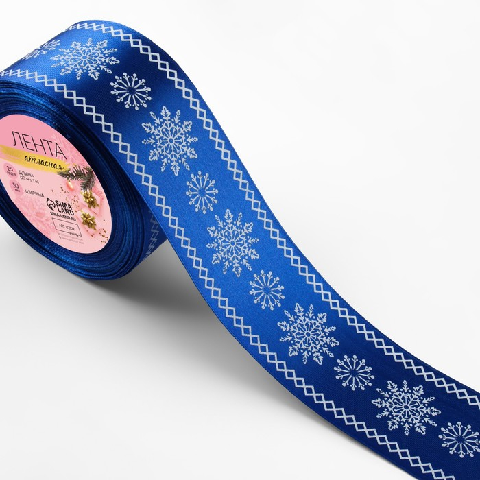 Лента атласная «Снежинки», 50 мм × 23 ± 1 м, цвет синий №122