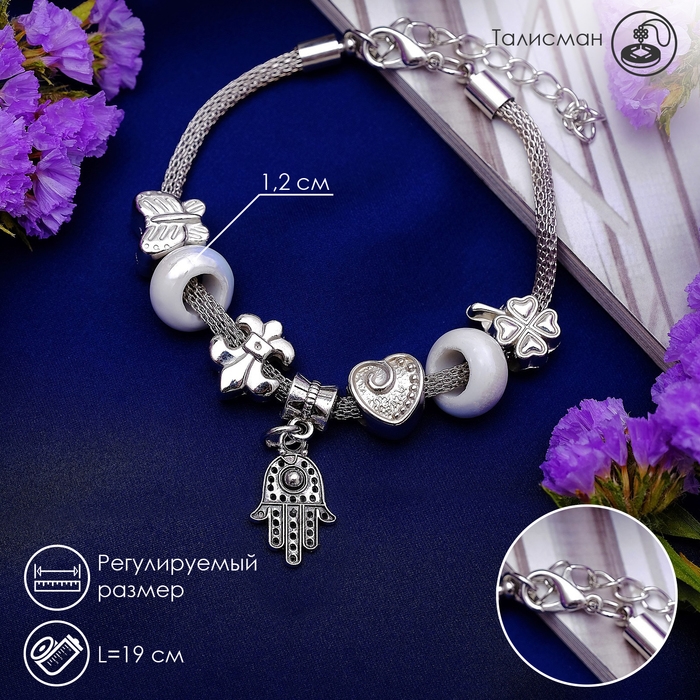 Браслет «Марджери» рука хамса, цвет белый в серебре, L=19 см