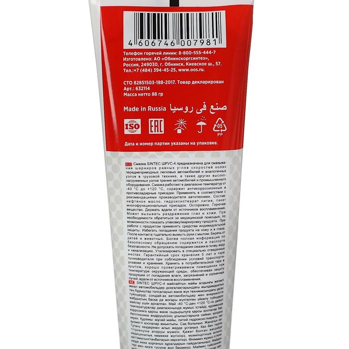 Смазка Sintec ШРУС-4 изготавливается путем загущения смеси высококачественных нефтяных масел литиевым мылом 12-гидроксистеариновой кислоты с добавлением пакетов присадок, обеспечивающих высокие антифрикционные, антикоррозионные и антиокислительные свойства. Содержит дисульфид молибдена МoS2 и наполнитель PTFE.