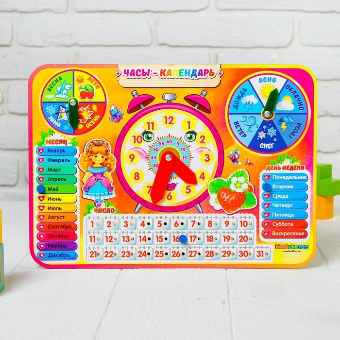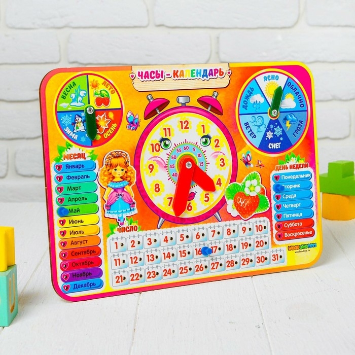 Часы-календарь — это многофункциональная развивающая игрушка для знакомства малыша с понятием времени. Представляет собой красочный деревянный планшет с подвижными стрелками и съёмными пластиковыми деталями-указателями.