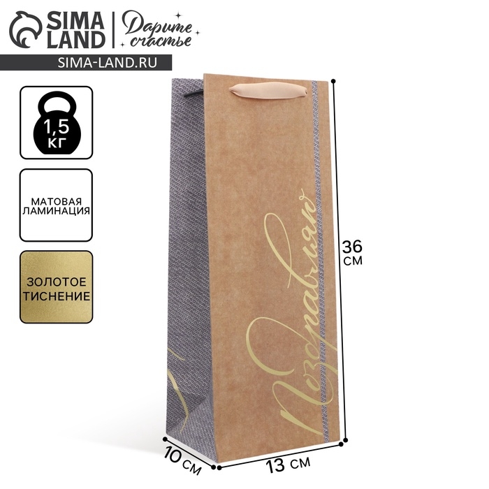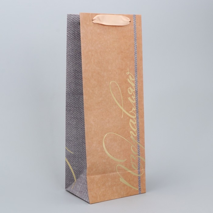 Пакет подарочный крафтовый под бутылку, упаковка, «#Поздравляю», 12 х 36 х 10 см