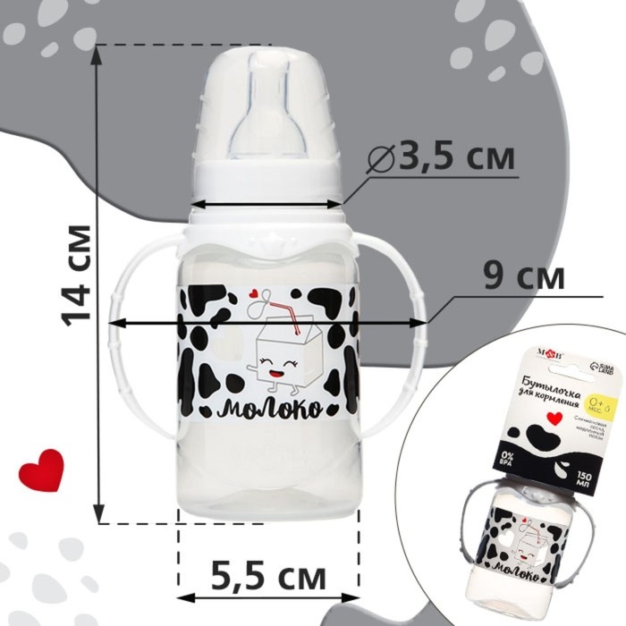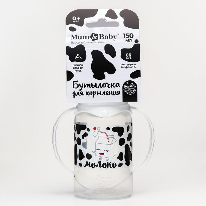 Бутылочка для кормления «Люблю молоко», классическое горло, с ручками, 150 мл., от 0 мес., цвет белый