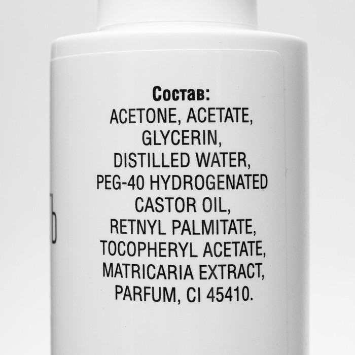 Состав: ACETONE, ACETATE, GLYCERIN, DISTILLED WATER, PEG-40, HYDROGENATED CASTOR OIL, RETNYL PALMITATE, TOCOPHERYL ACETATE, MATRIACARIA EXTRACT, PARFUM, CL 45410.
