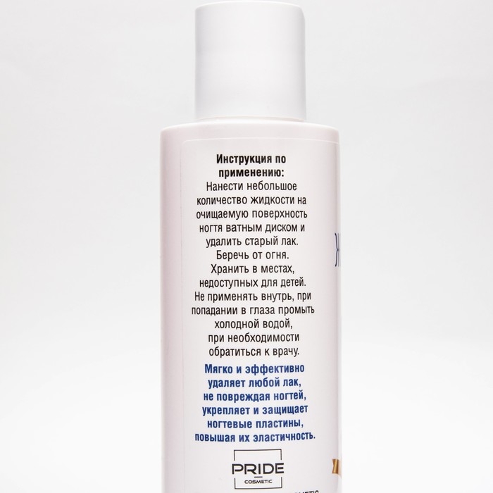 В составе имеет ацетон. Легко удаляет любые виды лаков и блесток. Не сушит ногти. Имеет легкий приятный аромат. Подходит для регулярного применения.