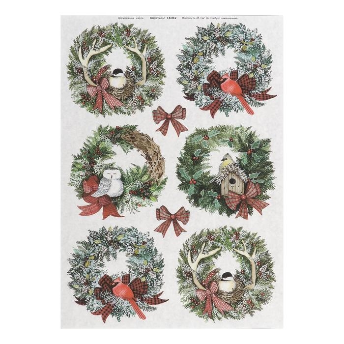 Декупажная карта "Новогодние венки с птицами" плотность 45 г/м2, формат А4