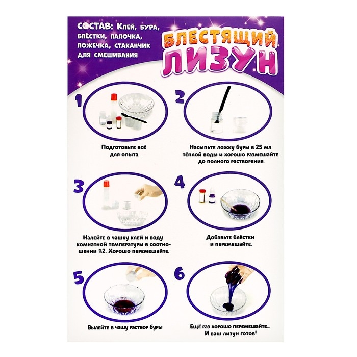 Набор для опытов «Блестящий лизун» позволит ребёнку провести увлекательный эксперимент по химии и создать необычный лизун своими руками.