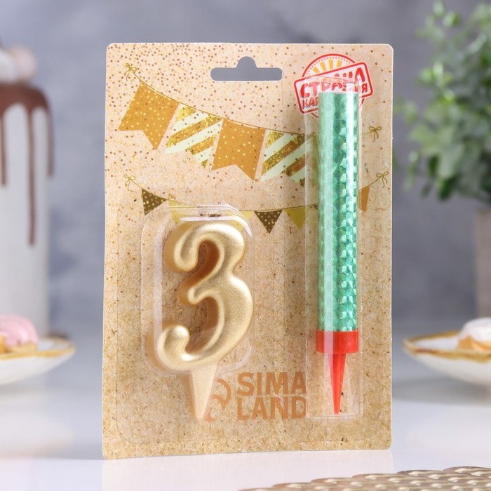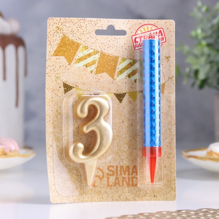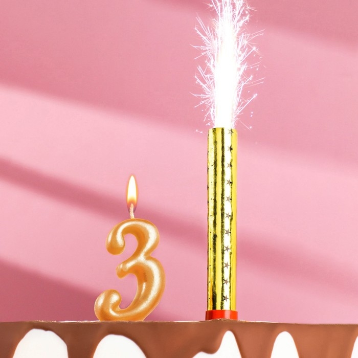 Свеча для торта цифра "3", "Овал + фонтан" золотая