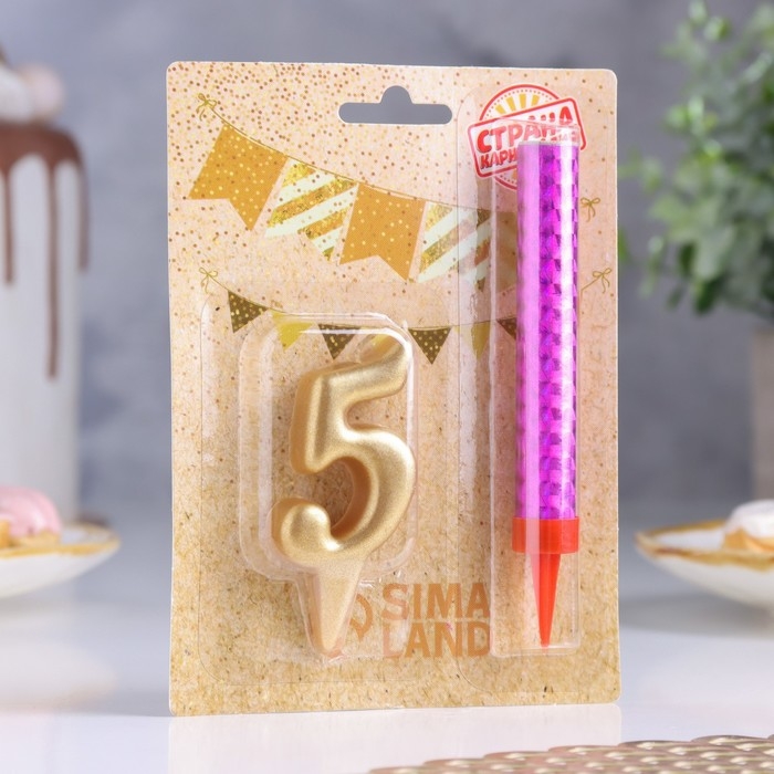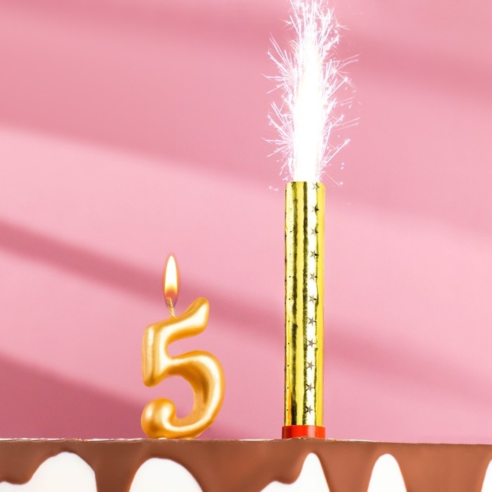 Свеча для торта цифра "5", "Овал + фонтан" золотая