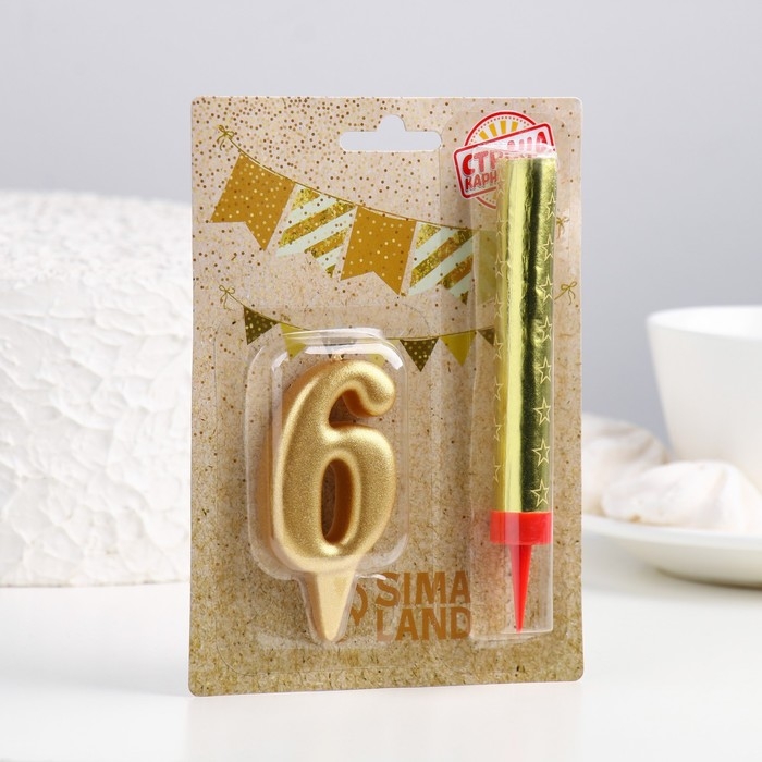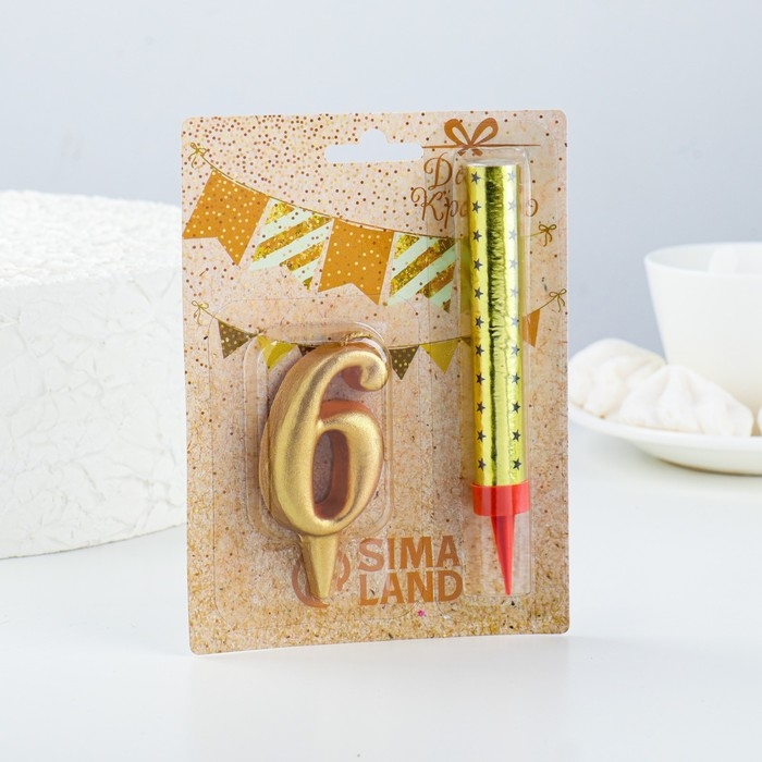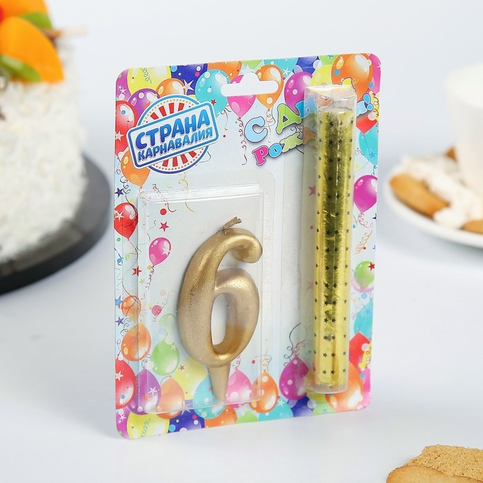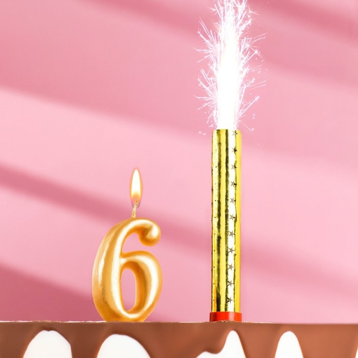 Свеча для торта цифра "6", "Овал + фонтан" золотая