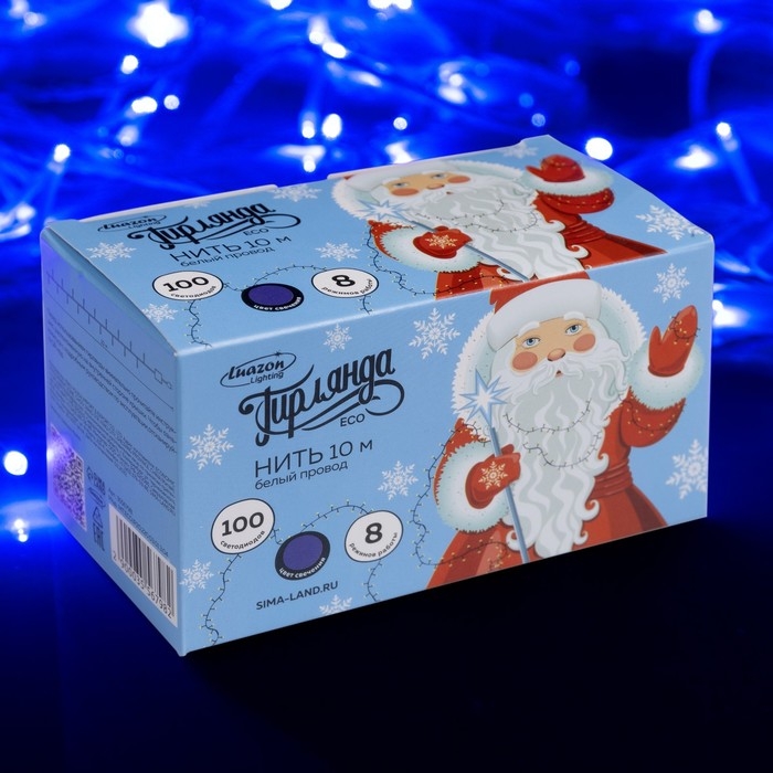 Гирлянда «Нить» 10 м, IP20, белая нить, 100 LED, свечение синее, 8 режимов, 220 В