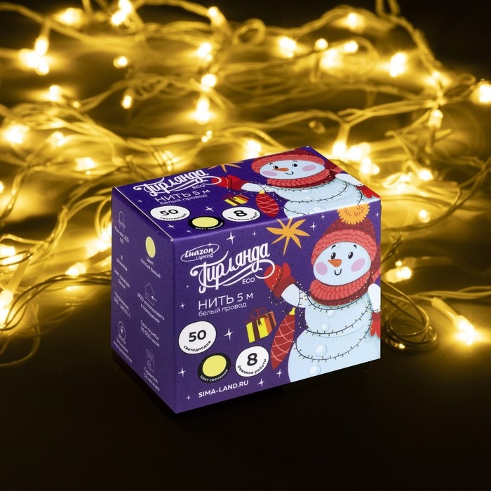 Гирлянда «Нить» 5 м, IP20, белая нить, 50 LED, свечение тёплое белое, 8 режимов, 220 В