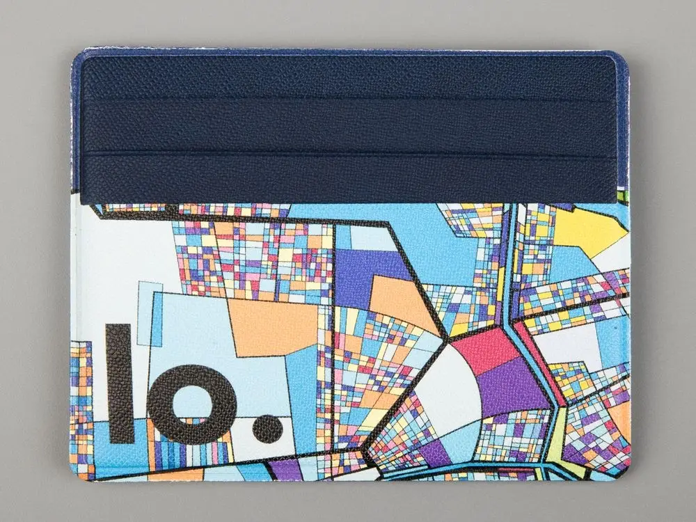 Чехол для карточек из искусственного материала, имитирующего сафьяновую кожу, с шестью отделениями для кредитных карт и одним — для сложенных купюр.