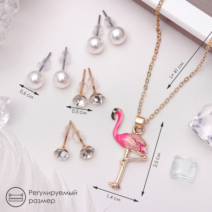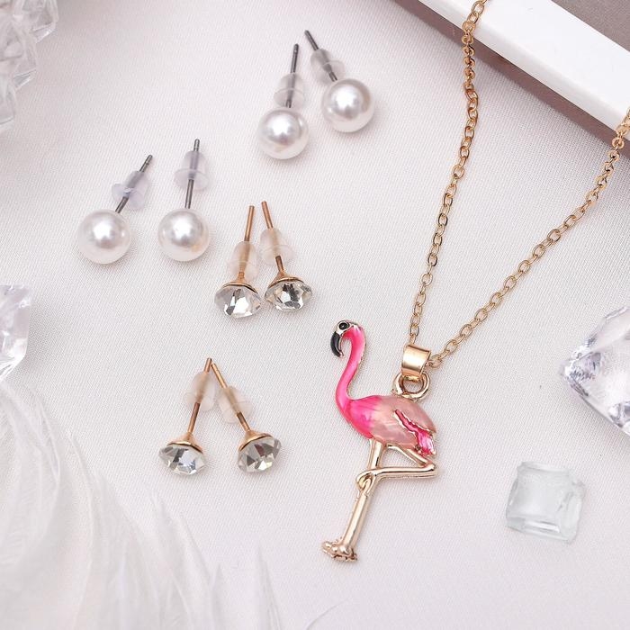 Гарнитур 5 предметов : 4 пары пусет, кулон «Фламинго», цветной в золоте, 43 см