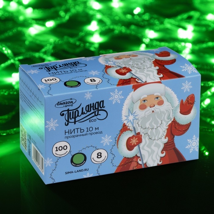 Гирлянда «Нить» 10 м, IP20, прозрачная нить, 100 LED, свечение зелёное, 8 режимов, 220 В