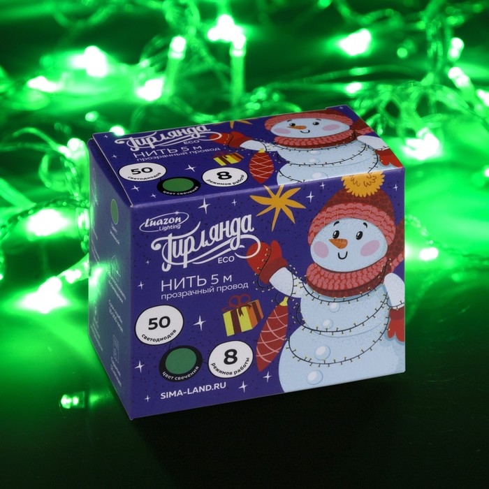 Гирлянда «Нить» 5 м, IP20, прозрачная нить, 50 LED, свечение зелёное, 8 режимов, 220 В