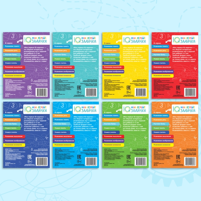 Набор блокнотов с заданиями «Мои первые IQ-задачки» включает в себя 8 книг на разные тематики: