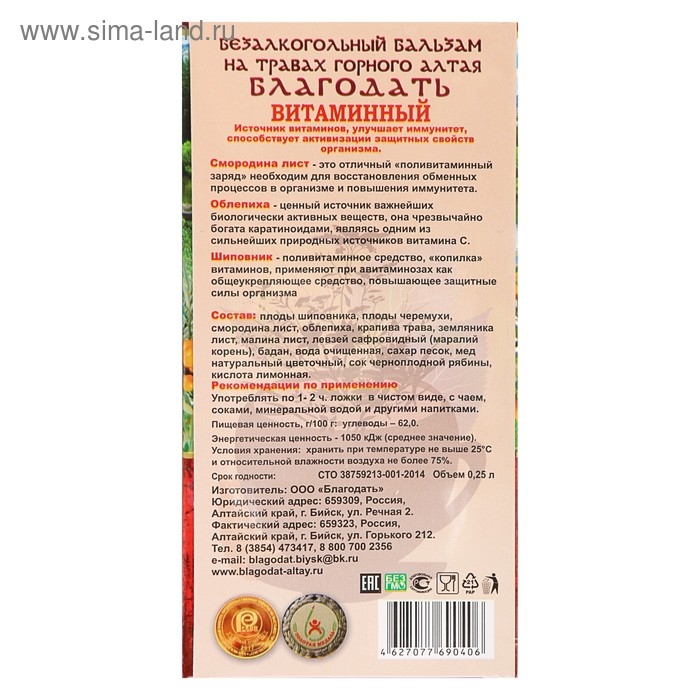 Бальзам безалкогольный "Благодать" витаминный, 250 мл