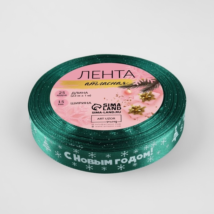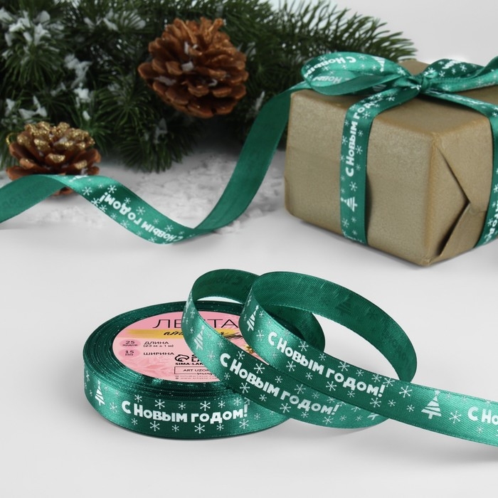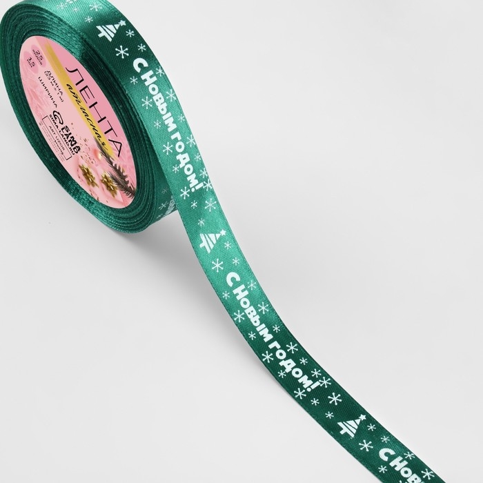 Новый год! Лента атласная «С Новым годом», 15 мм, 23 ± 1 м, цвет зелёный №56