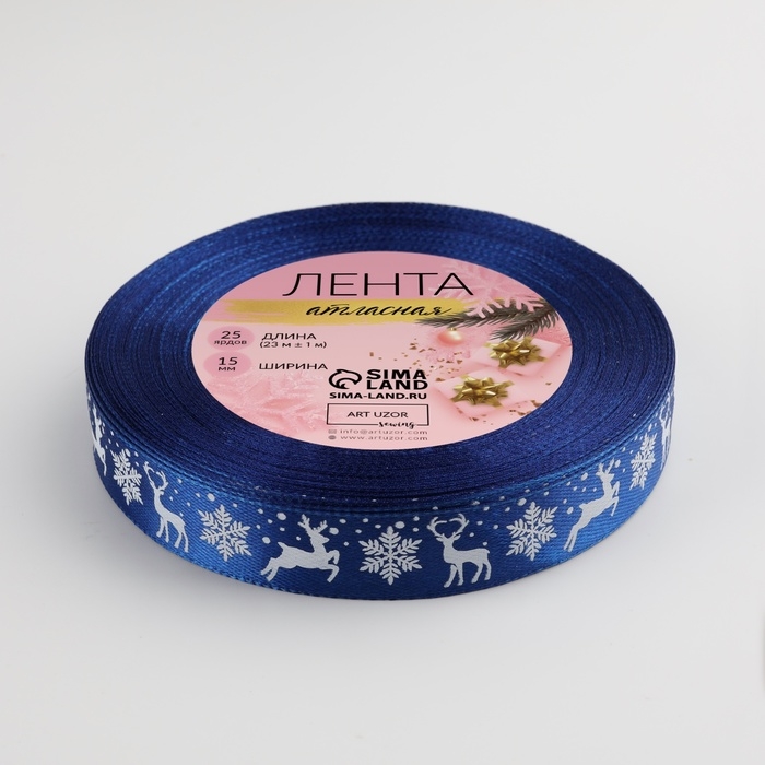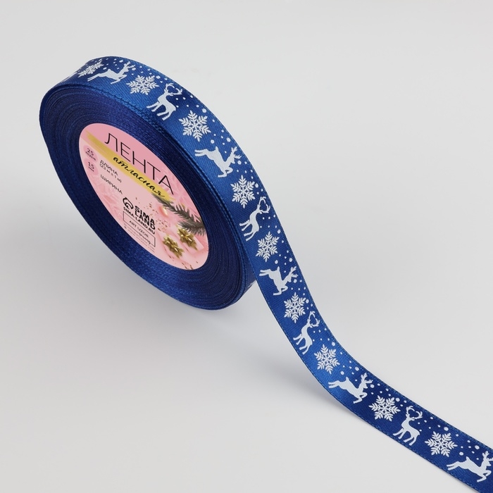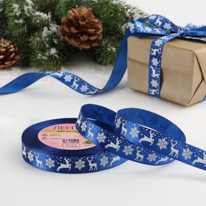 Новый год! Лента атласная «Олени», 15 мм, 23 ± 1 м, цвет синий №122