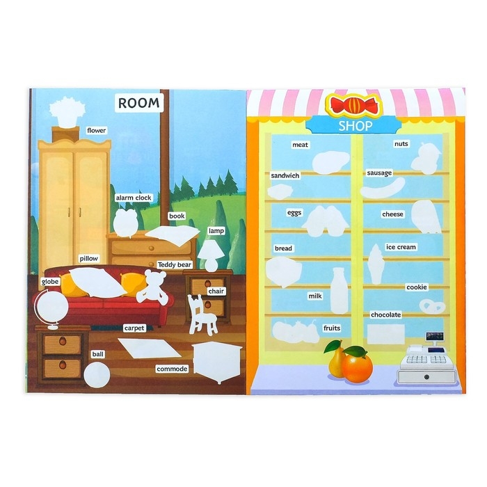 На каждой странице малыш найдёт задания, где необходимо приклеить картинки с соответствующими предметами или названия на английском языке. Упражнения положительно влияют на развитие мелкой моторики, внимания, речи и расширение кругозора.