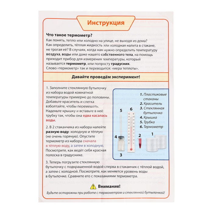 С набором «Эврики» ребёнок проведёт увлекательные опыты по химии, узнает, как работает термометр, и самостоятельно изготовит собственный прибор для измерения температуры.