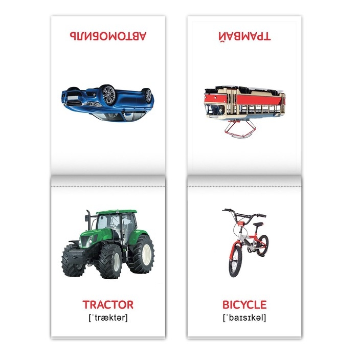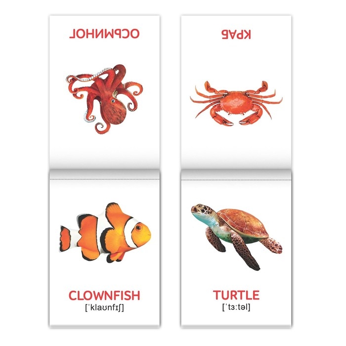 Карточки двусторонние: на одной стороне дано изображение животного и подпись на русском языке, на другой стороне — изображение животного и подпись на английском языке с транскрипцией. Пособие создано по методике раннего развития Домана. Американский врач-физиотерапевт Глен Доман предлагал каждый день показывать малышам специальные карточки в течение нескольких секунд. И сопровождать их изображениями предметов, например овощей и животных, подписанных красным цветом. Дети, видя их, запоминают слова. Главное — чётко и громко произносить их названия.