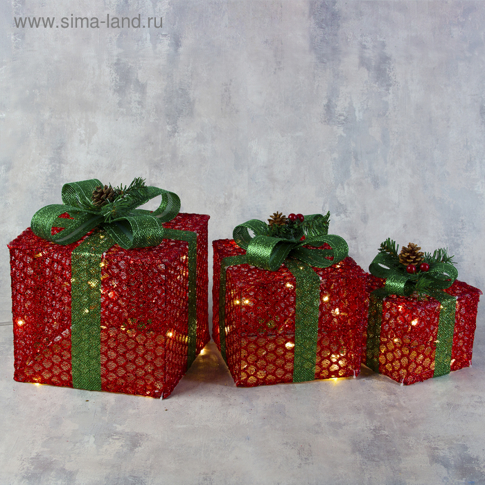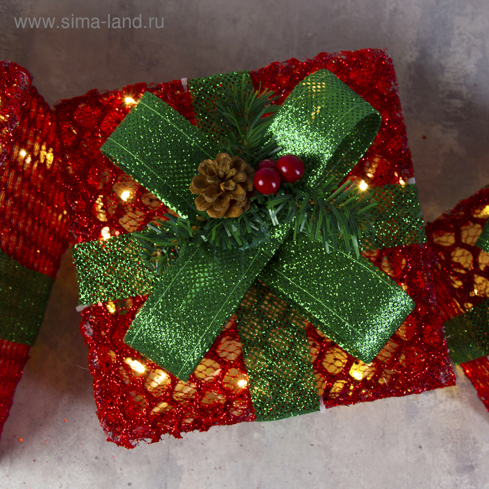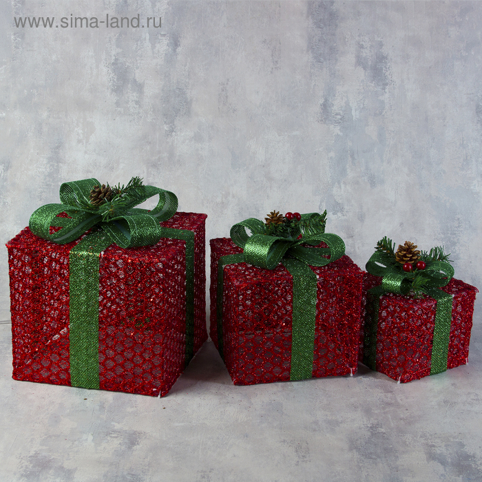 Светодиодная фигура «Подарки с зелёной лентой» 15, 20, 25 см, текстиль, металл, 220 В, свечение тёплое белое